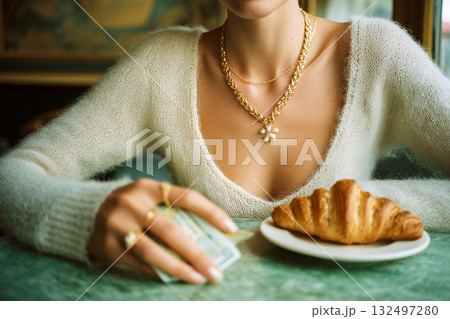 A woman is sitting at a table with a croissant and a stack of bills