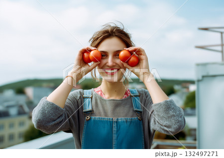 A woman is holding two tomatoes in her hands and smiling
