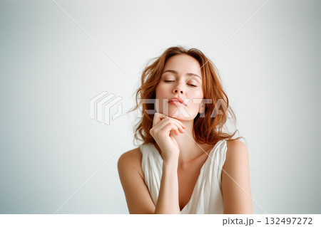 A woman is sitting on a bed with her hand on her face