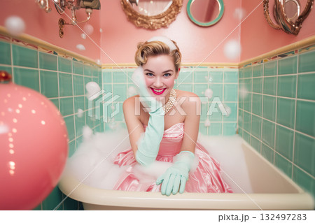 A woman in a pink dress is posing in a bathtub with a pair of rubber gloves