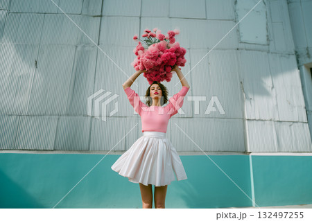 A woman in a red skirt is leaping into the air