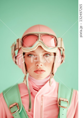 A woman in a suit and helmet stands in front of a building