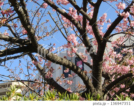 咲き進む稲毛海岸駅前の河津桜