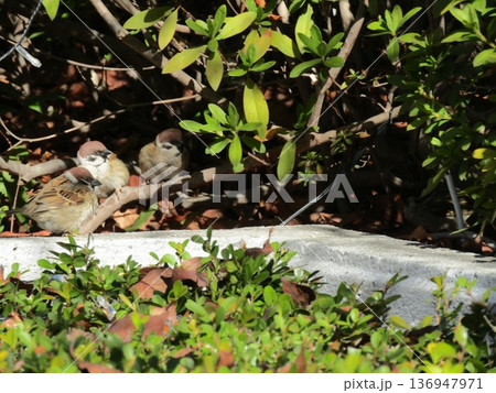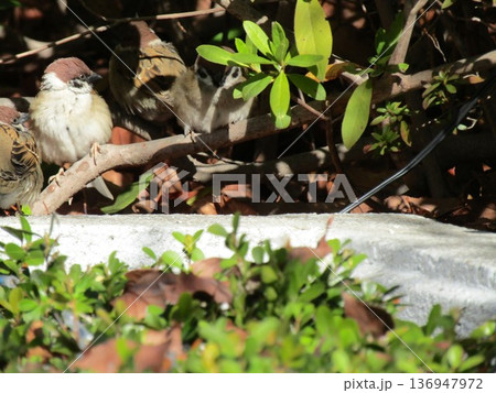 稲毛海岸駅前河津桜並木に来た里の鳥スズメ