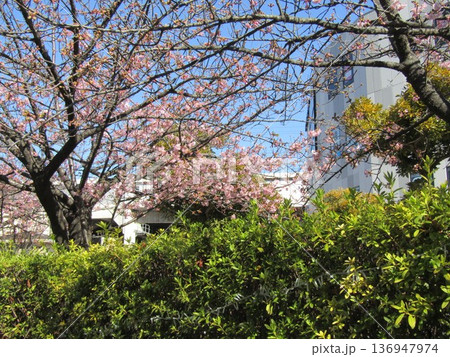 稲毛海岸駅前咲き進む河津桜