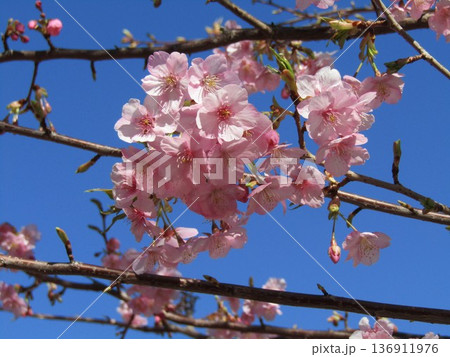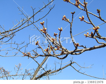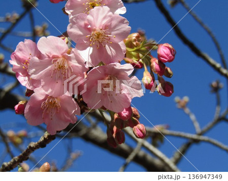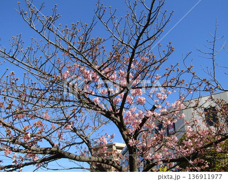 咲き進む稲毛海岸駅前河津桜蕾が沢山の木