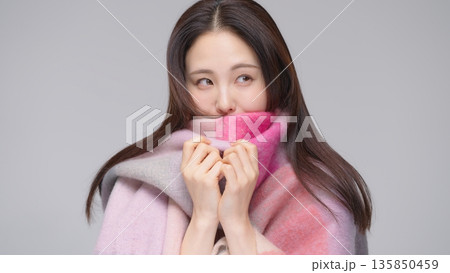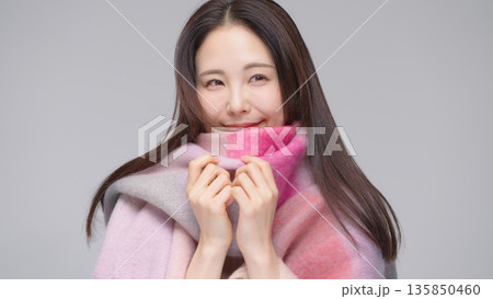 ピンクのマフラーをした30代女性