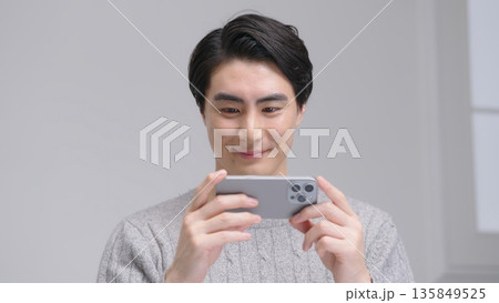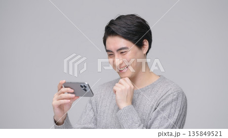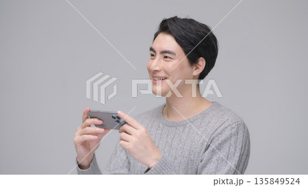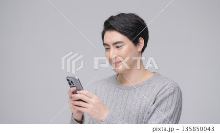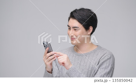 スマホを操作する30代男性 グレーバック