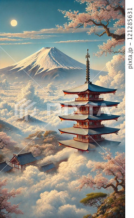 【AI画】雲にはのらぬものなれど 山里に咲く桜五重塔富士山雲海日本AIアートAIイラストAI生成画像