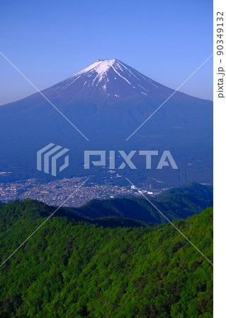 富士吉田市富士見孝徳公園の5月の木々と富士山