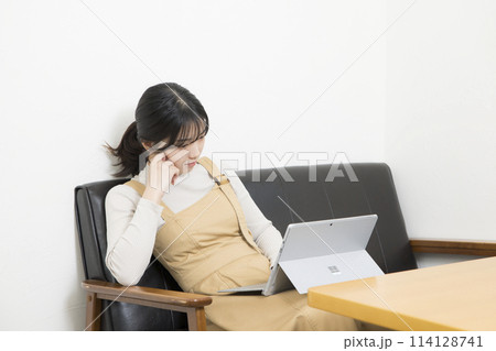 ノートパソコンとスマホを使用している若い女性