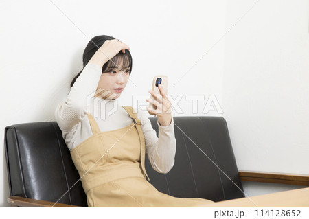 スマートフォンで髪型をチェックする若い女性