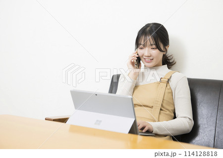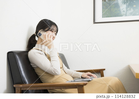 椅子に座りスマホで通話する若い女性