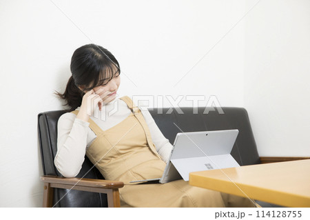 ソファに座りタブレットを使用する若い女性