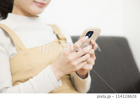 ソファでスマホを操作する若い女性