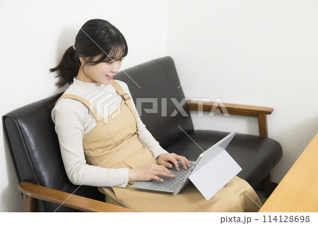 ソファに座ってPCを使用する若い女性