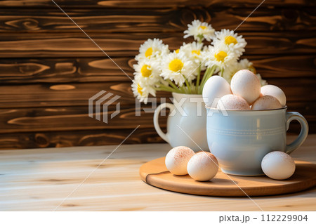 AI-generated content. Easter background. Fresh daffodils in a vase and eggs, rustic background