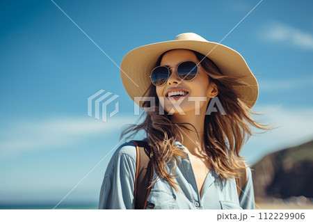 AI-generated content. Portrait of happy young woman in casual clothes and straw hats at seaside. Vacation, summer holiday concept