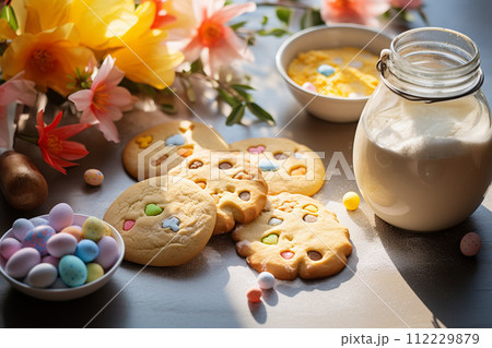 AI-generated content. Grandmother and granddaughter child baking in the kitchen, baking cookies. easter, spring time