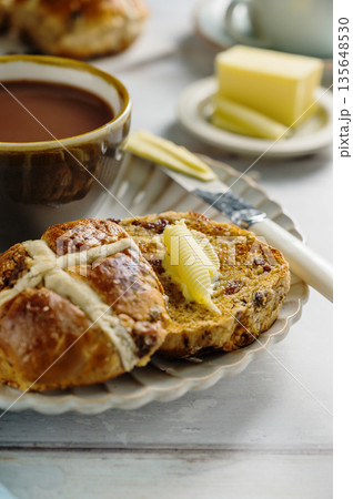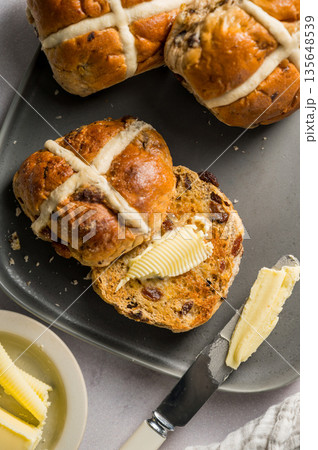 Cross Buns with butter in a plate. Breakfast concept. Close up shot. Easter treat buns