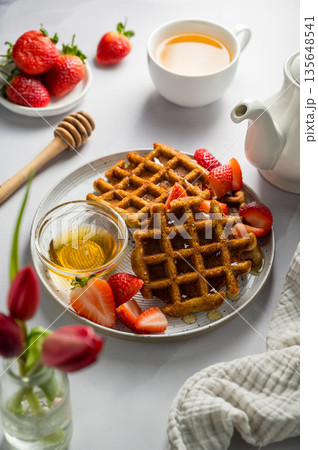 Belgian waffles with strawberries and honey, cup of tea and fresh fruits. Homemade breakfast food, top view