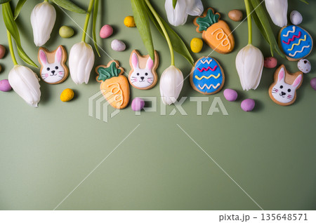 Easter festive background. Colourful easter cookies bunny, egg, chick and carrot. White spring tulips bouquet.