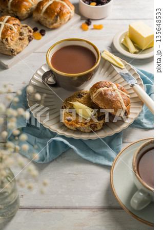 Easter food table setting. Cross Buns with butter, served with tea. Breakfast concept