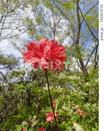 新緑青空背景の逆光に輝くヤマツツジ