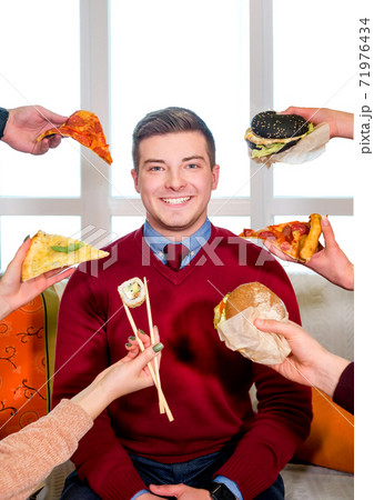 Junk food. Diverse fast food. The guy on the couch. In front of a man hands with sushi, pizza and burger.