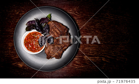 Roasted meat on a plate. Restaurant food. Grilled meat steak with sauce. Wooden background.