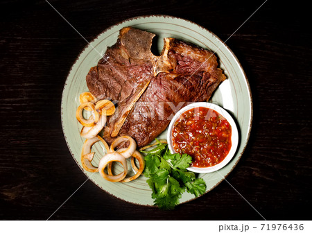 Roasted meat on a plate. Restaurant food. Grilled meat steak with sauce. Wooden background. T-bone.