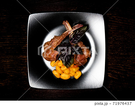 Grilled meat on a plate. Restaurant food. Lamb rack dish with pasta.
