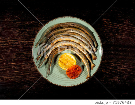 Grilled fish on a plate. Restaurant food. Fish dish with lemon.