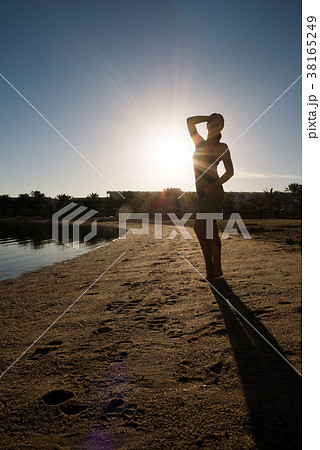 Girl stands on the beach against the sunset.