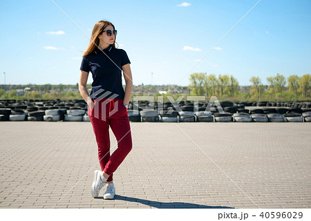 Stylishly dressed young woman in glasses stands in the middle of a stone square against the