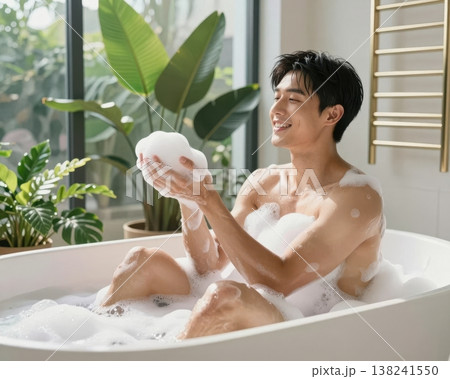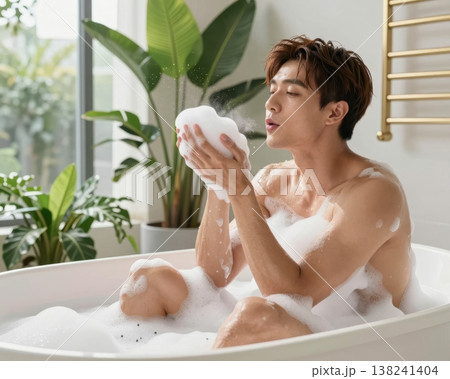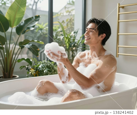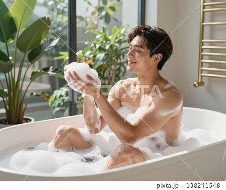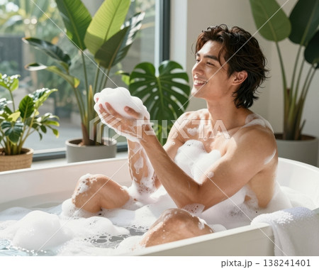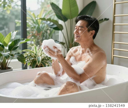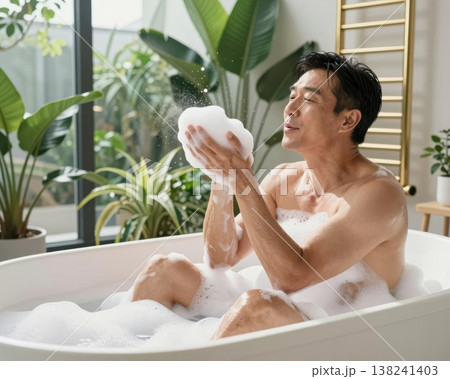Relaxed Asian man enjoying a bubble bath in a modern bathtub with foam, sunlight, and tropical plants in a bright bathroom interior.