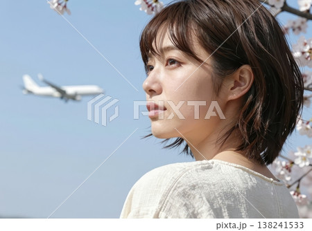 Profile view of contemplative young Asian woman gazing at airplane flying against clear blue sky.