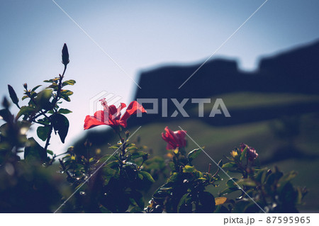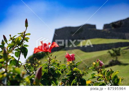 勝蓮城趾と青空をバックに咲くハイビスカス
