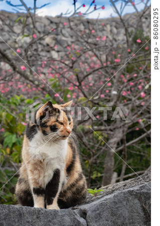 世界遺産の城壁と寒緋桜の前に佇む猫
