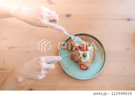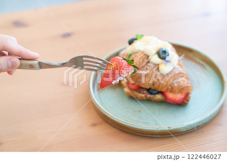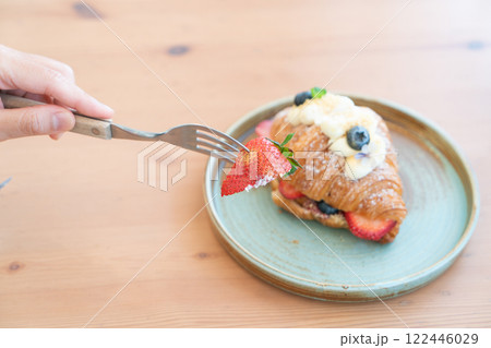 Fresh Strawberry and Blueberry Cream Croissant on a Rustic Ceramic Plate