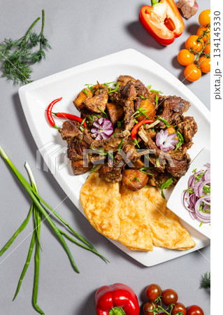 Top view of braised ribs with potatoes and onions on grey background - appetizing dish