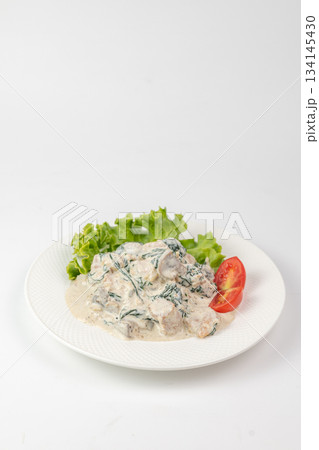 Close-up of chicken in creamy sauce with spinach and mushrooms on white background - appetizing dish