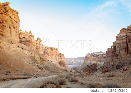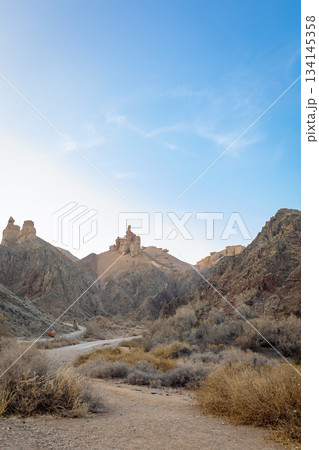 Wide shot of canyon with dusty road and rock castles - wild nature of Kazakhstan