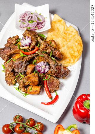Close-up of braised ribs with potatoes on grey background - meat and vegetable texture