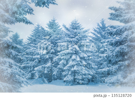 Snow covered winter forest with dense evergreen trees and gentle falling snow. Cold seasonal landscape with frosted branches, soft light and calm atmosphere. Perfect for winter backgrounds, Christmas