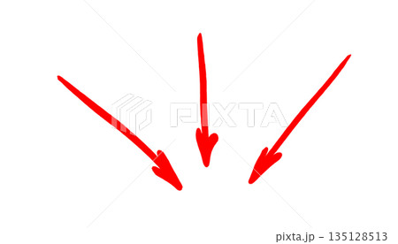 Three red arrows hand-drawn on transparent background. Marker sketch arrows pointing down to center, drawn by hand in doodle style for infographic, highlight, or creative design projects.