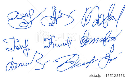 Hand-drawn blue scribble signatures set isolated on white background. Doodle sketch faux autograph collection for notes, highlights, graphic design, or creative decorative elements.
