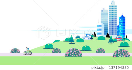 ツツジの咲く公園の道を自転車で走る人物と高層ビル群のフラットイラスト
