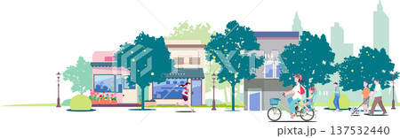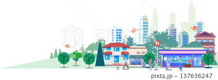 街並みと人々のライフスタイルのベクターイラスト 背景素材 パノラマ