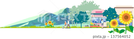 ひまわりが咲く夏の街並みと犬の散歩をする親子、背景に広がる青い山々のフラットイラスト